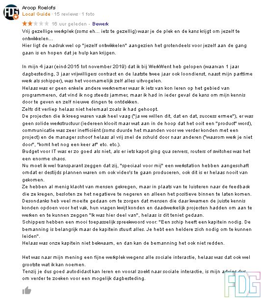 Fairly sociable workplace (sometimes eh... a bit too sociable) where you get the room and chance to develop yourself... The emphasis laying on the "develop yourself" as you mainly need to do things for yourself and hope you can get the help you need. In my 4 years (end-2015 to November 2019) that I have been at WerkWent (of which 1-year daytime spending, 3 years under voluntary contract and two years also under employment), it was mainly figuring out things myself. Unfortunately, there was no other employee from whom I could learn anything in the field of programming, I still think it's a bummer but at least I had a chance to pass on my knowledge and discover new things myself. Unfortunately, even that didn't go as I had hoped for. The projects I got where often very vague ("yes we want this, that and that, good luck with it"), there was no solid working structure (everybody just hammered away in the hope it would someday become a "product"), communication was very inefficient (sometimes it took months before we could continue on a project) and the manager was quick to shift the blame to others ("why don't you continue working", "will it be finished anytime soon" etc. etc.). Budget for IT was nearly non-existent if something broke like a server, router or switch, it was massive chaos. Now, I do have to be transparent about something and that is that they, "especially for me" bought a new workstation because there were plans to also produce videos, unfortunately, this also never took shape. They have received a bunch of complaints from people, but instead of listening to the feedback they received, they decided to ignore the negative and only let the positive get in. Aside from that, I have put a lot of effort into making sure that the people that came in there would get the right knowledge for the trait, had a place to leave their questions and had an actual project to work on and say "I was part of that", unfortunately, this has all been for nothing. Shippers have a very applicable saying for this: "A ship needs a captain. The crew is important but the captain steers everything. You need a clear vision to lead". Unfortunately was our captain not capable and then the crew won't be able to make it either. It was, in my opinion, a comfortable workplace thanks to all the social interaction I had, unfortunately that is the biggest point I can call. Unless you are good at self-learning and mainly search for social interaction, my advice would be to search elsewhere for a fitting daytime spending.
